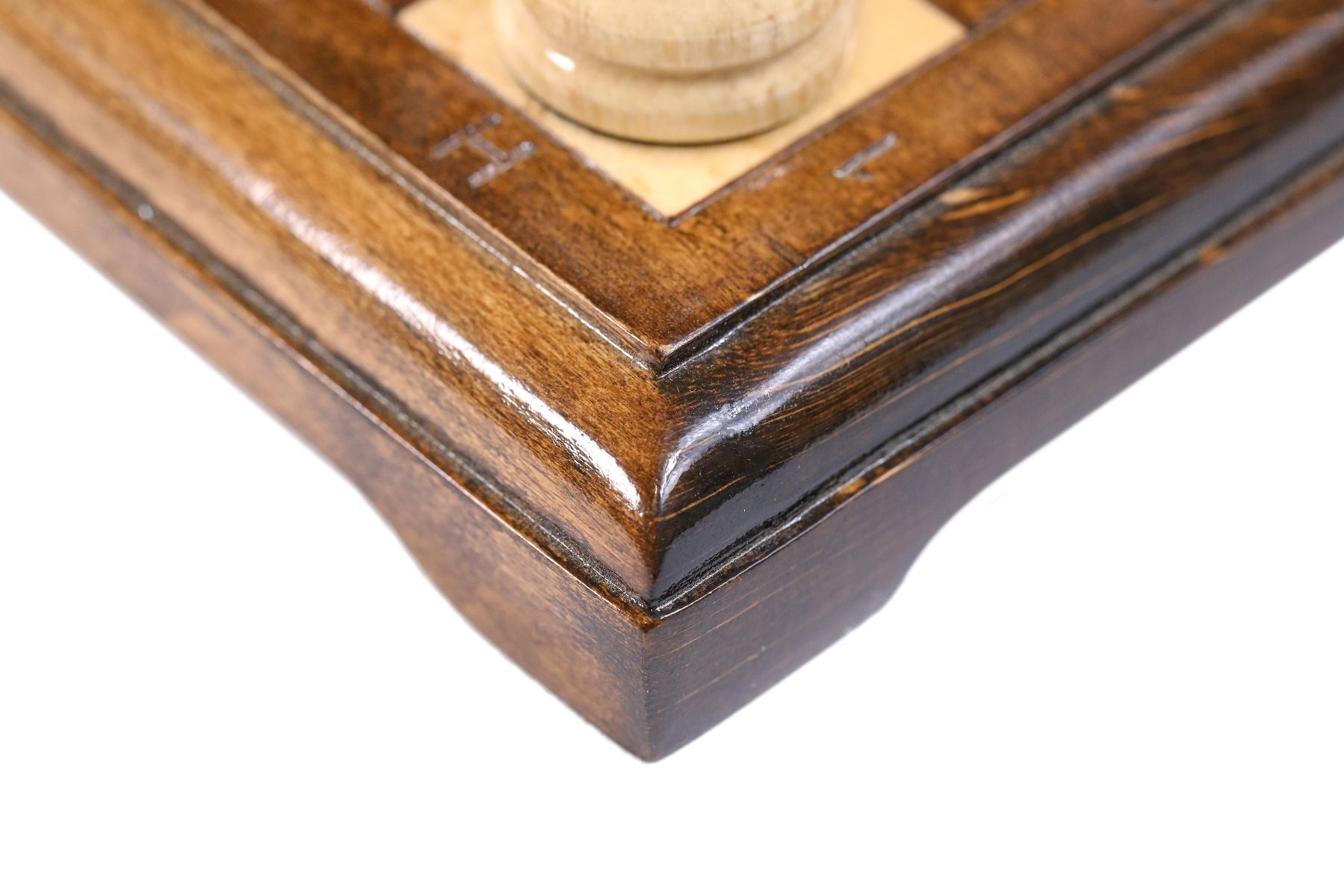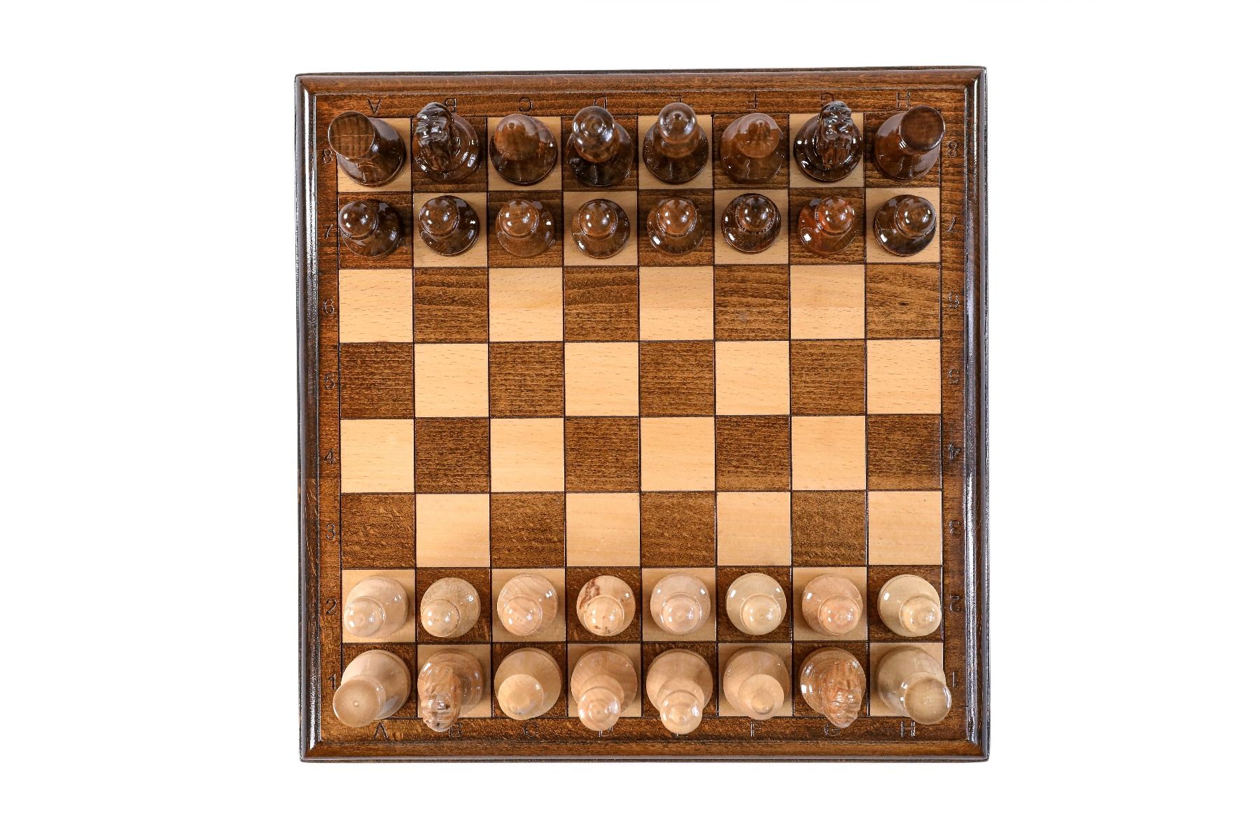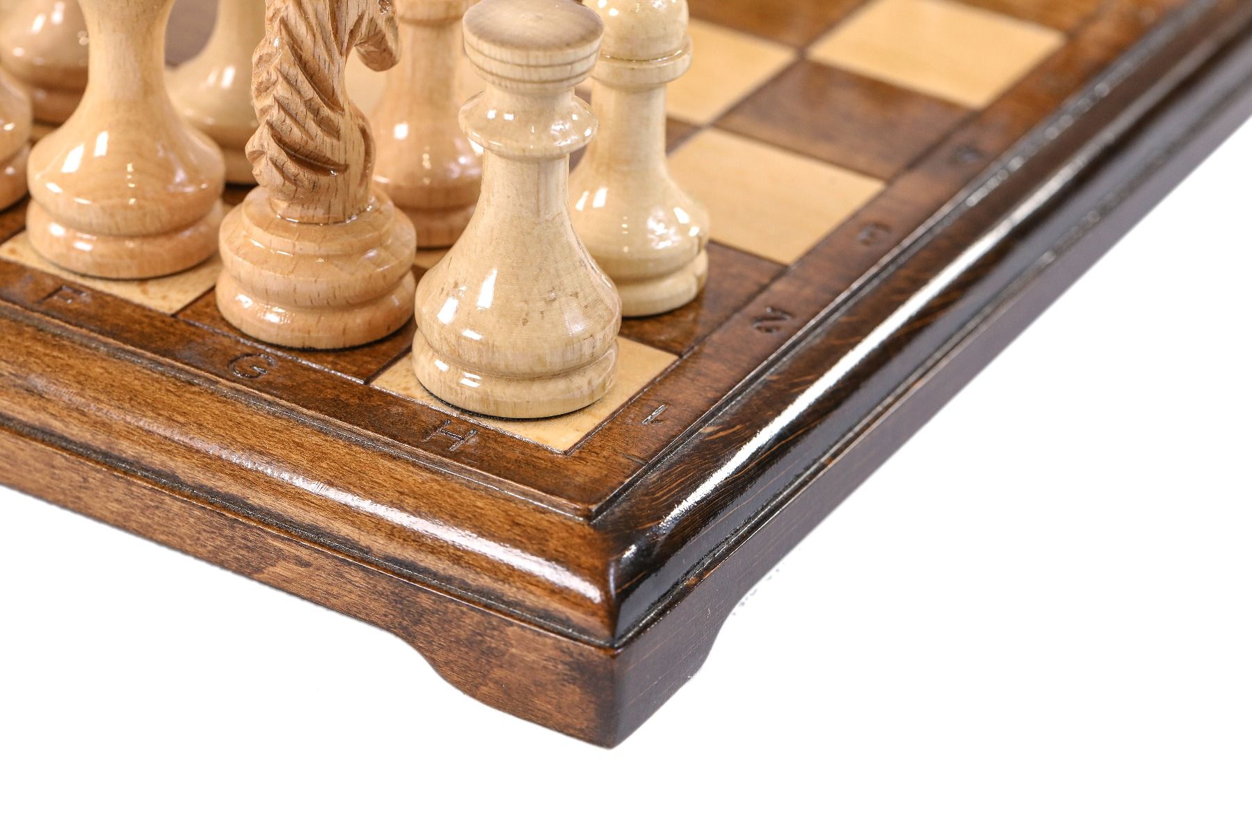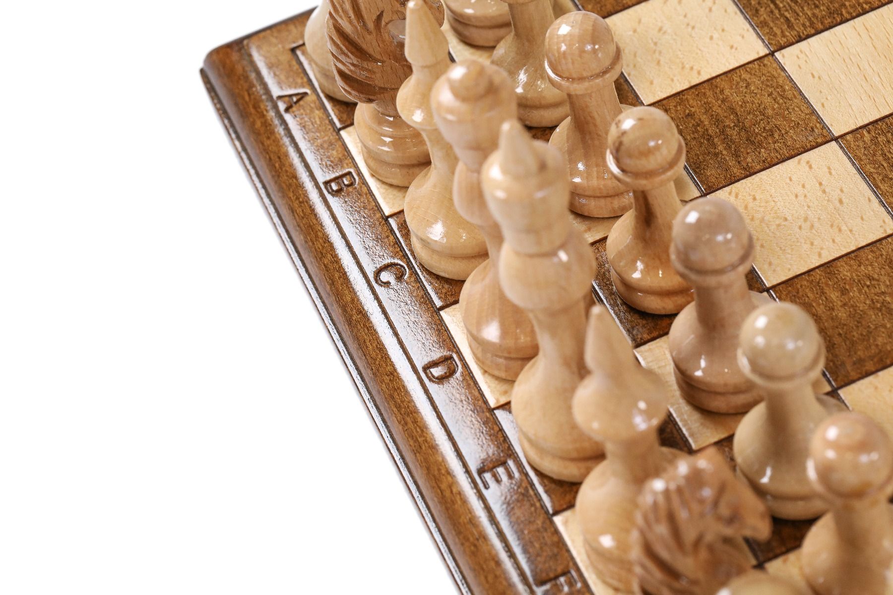 - 32 playing pieces, made of beech and walnut wood, with velvet fabric applied to the bottom of each piece,