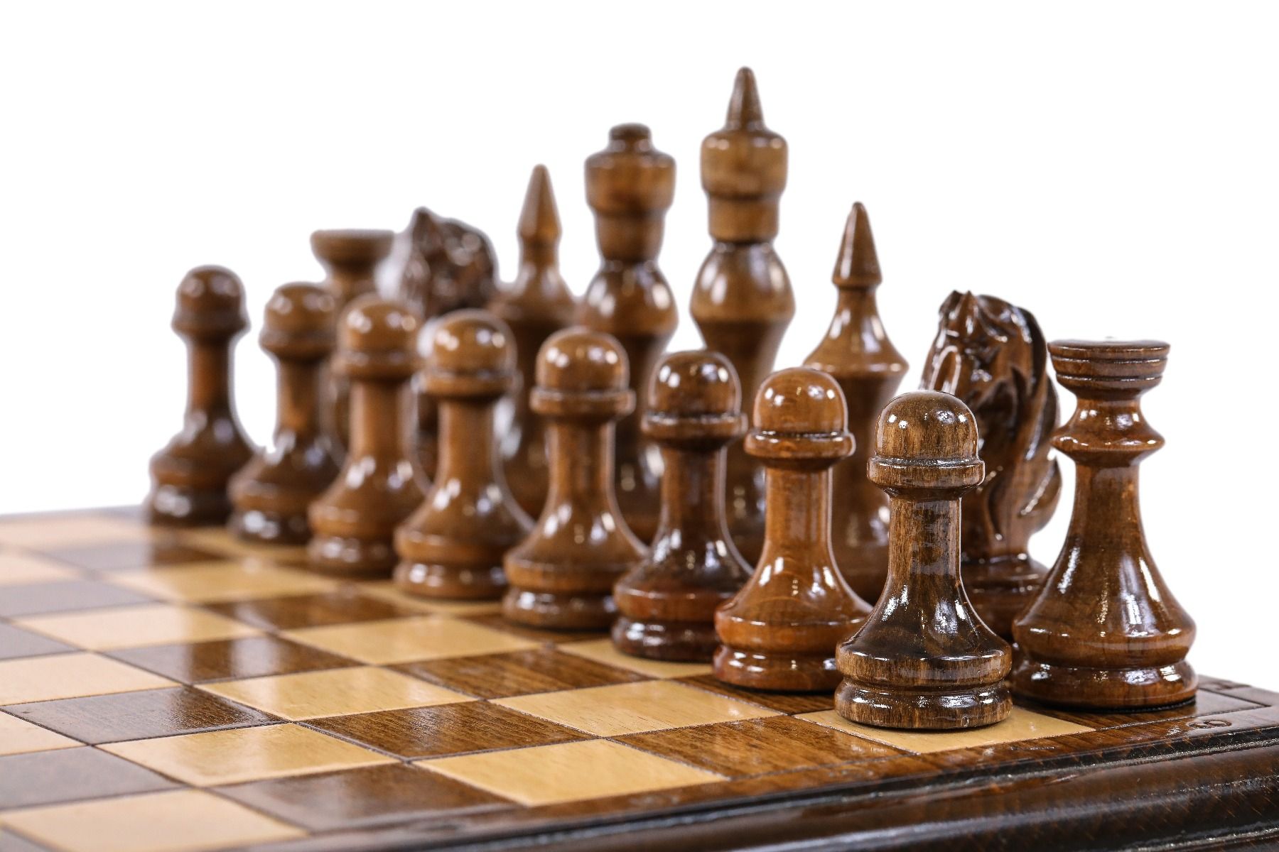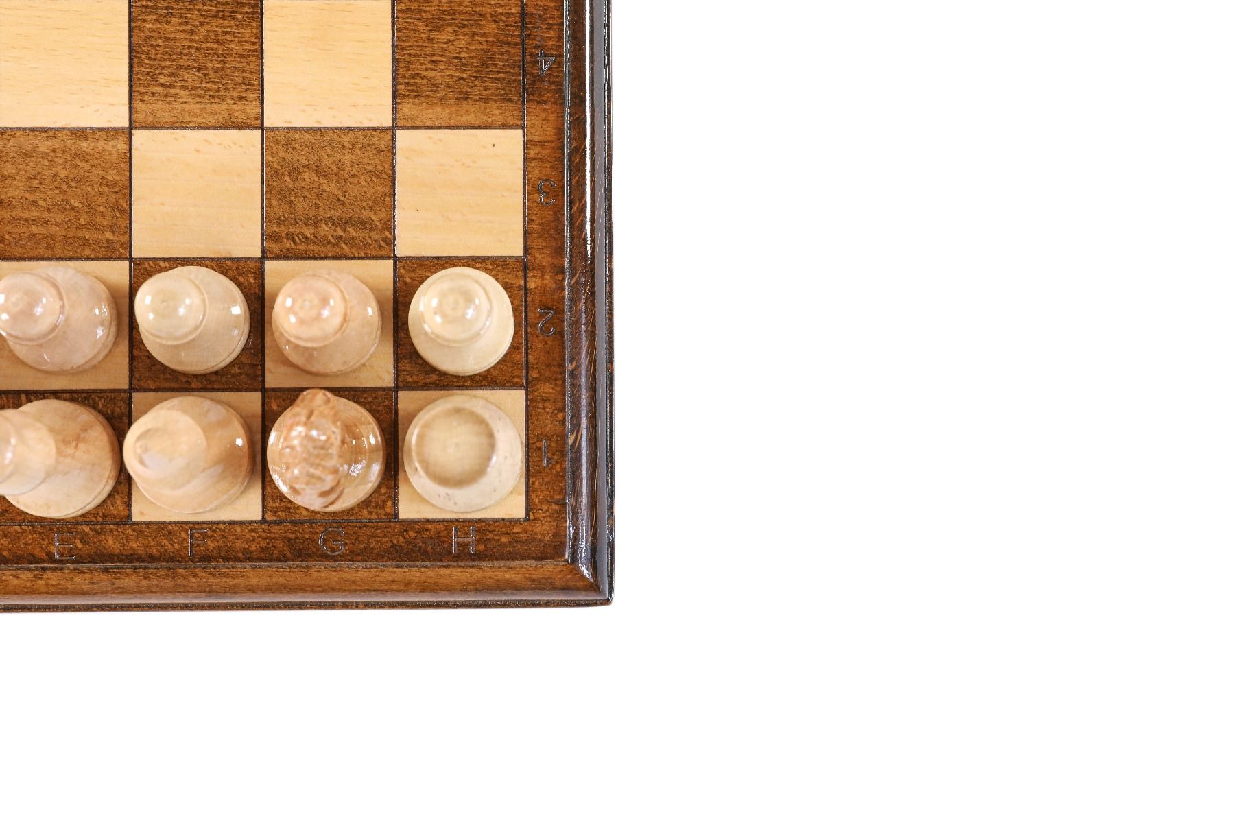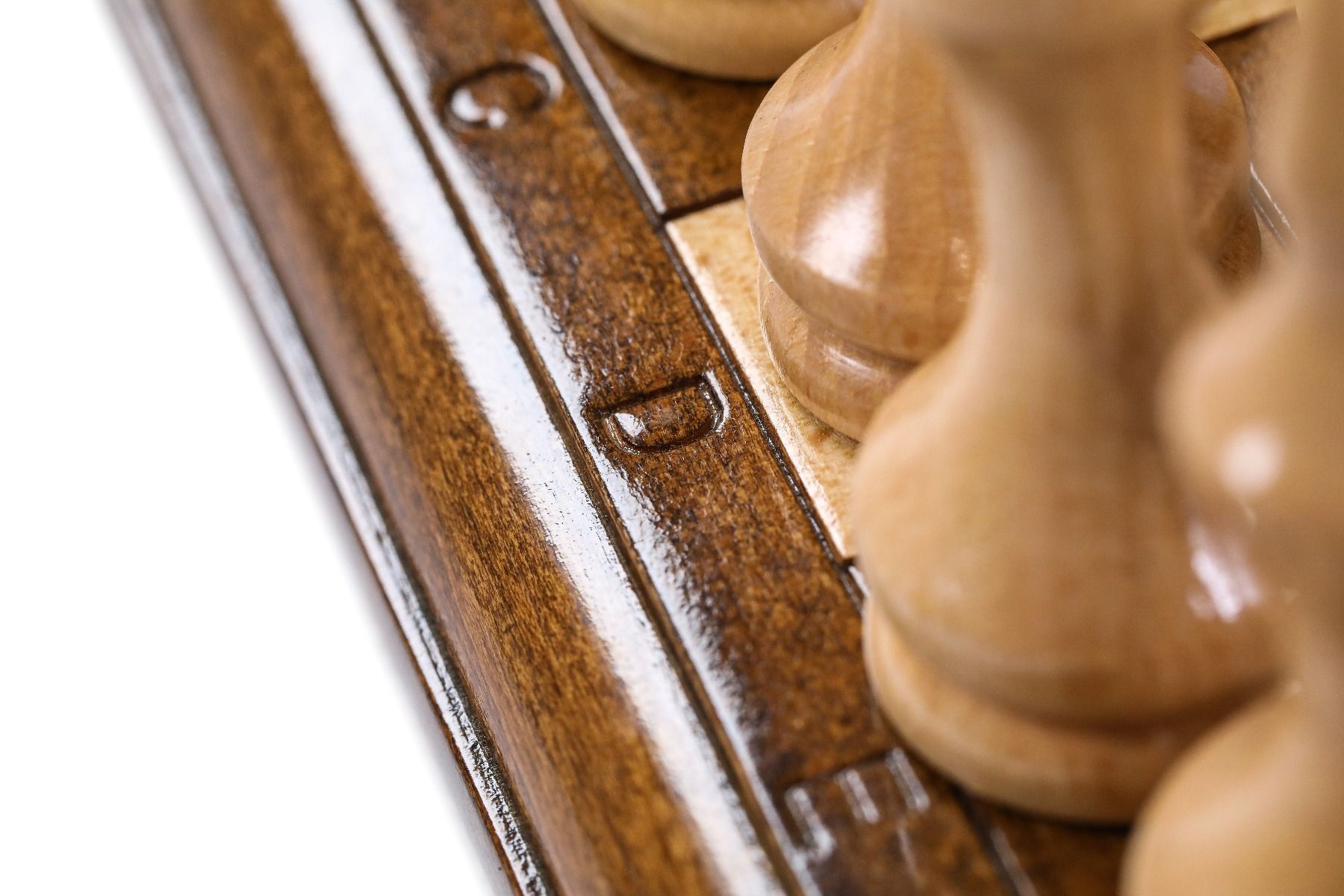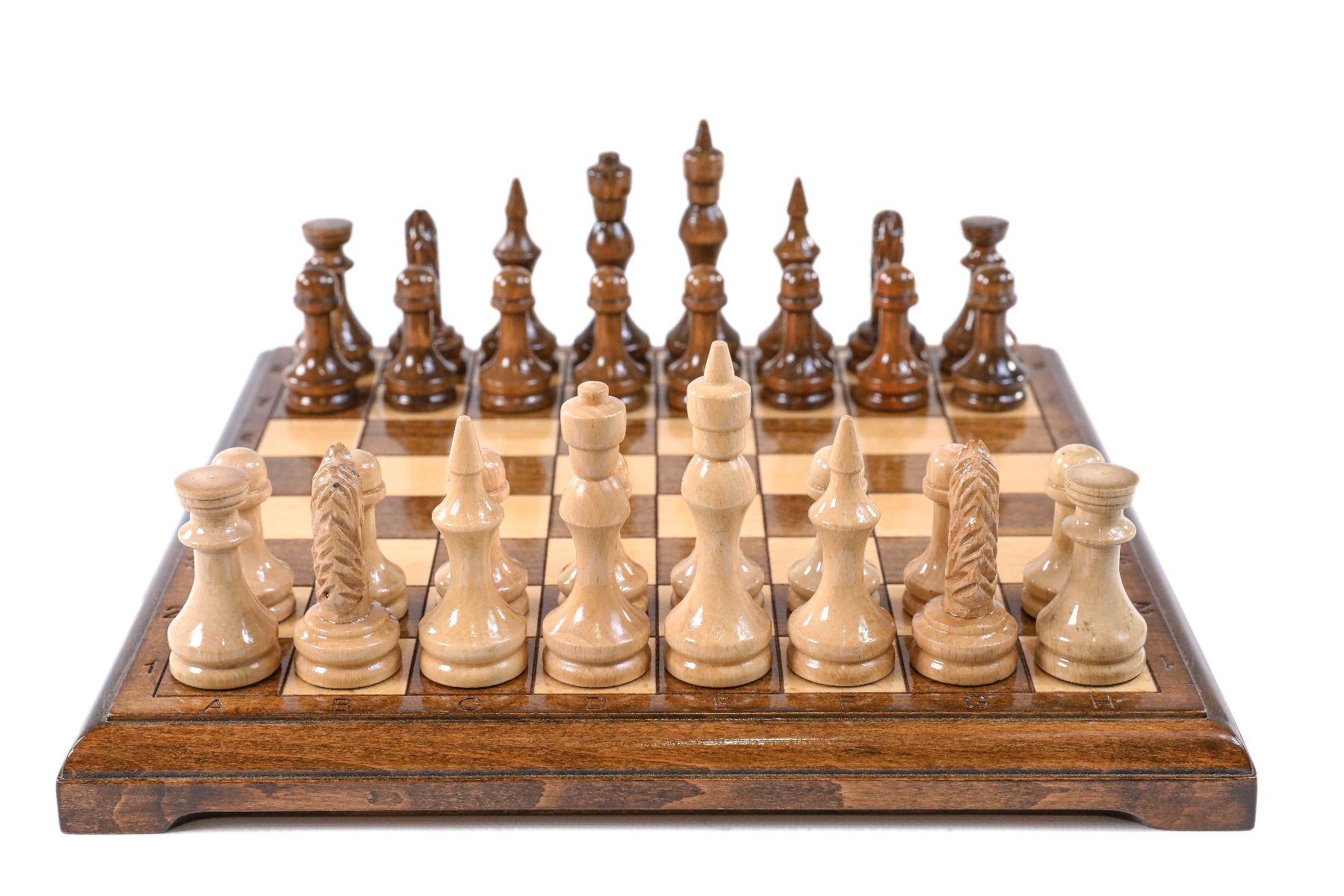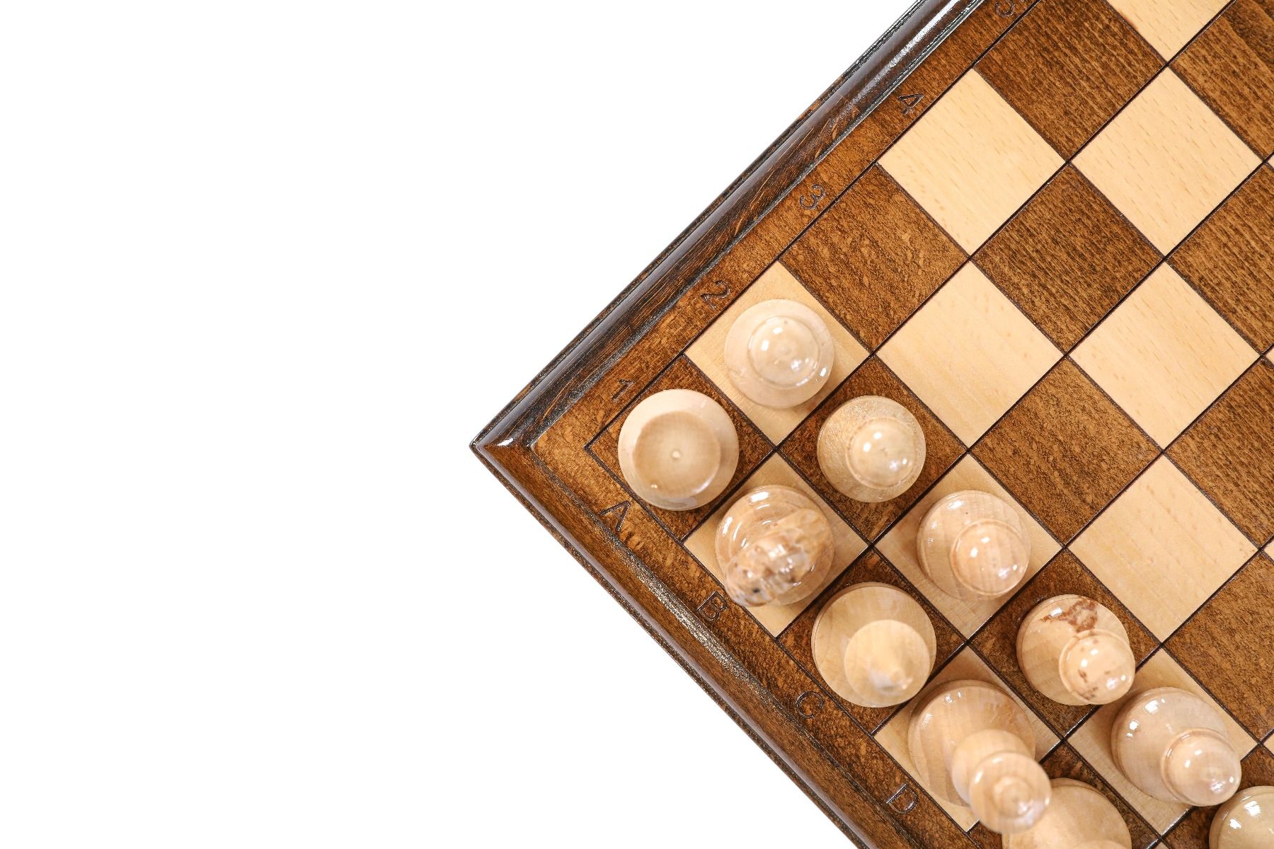 - 32 playing pieces, made of beech and walnut wood, with velvet fabric applied to the bottom of each piece,