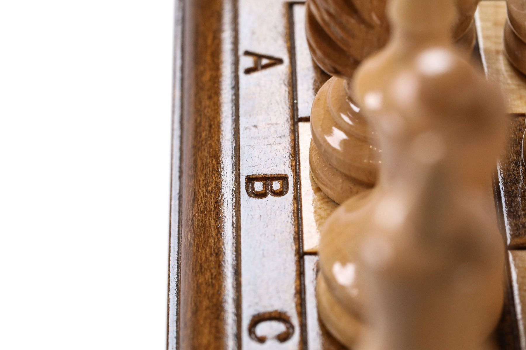 This unique chess set is carved from one piece of beech wood. This model is completely handcrafted. It is varnished. Letters and numbers are carved.