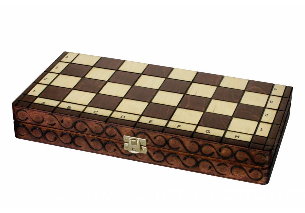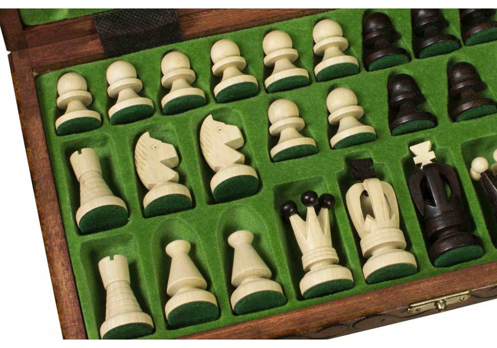 It is equipped with an insert for chess pieces.