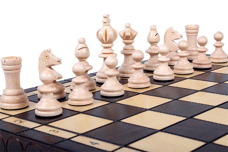 The 14-inch chess set consists of a beech and birch wood board that features hand-burned ornaments to add an extra twist to a classic design, and solid hornbeam and beech chessmen. The pieces are hand-polished and weighted for better balance and comfort during the game. They have a special tray for storage on the inside of the folding board, which makes this lightweight chess set great for travelling.