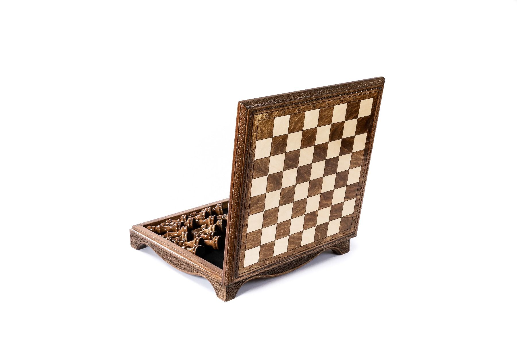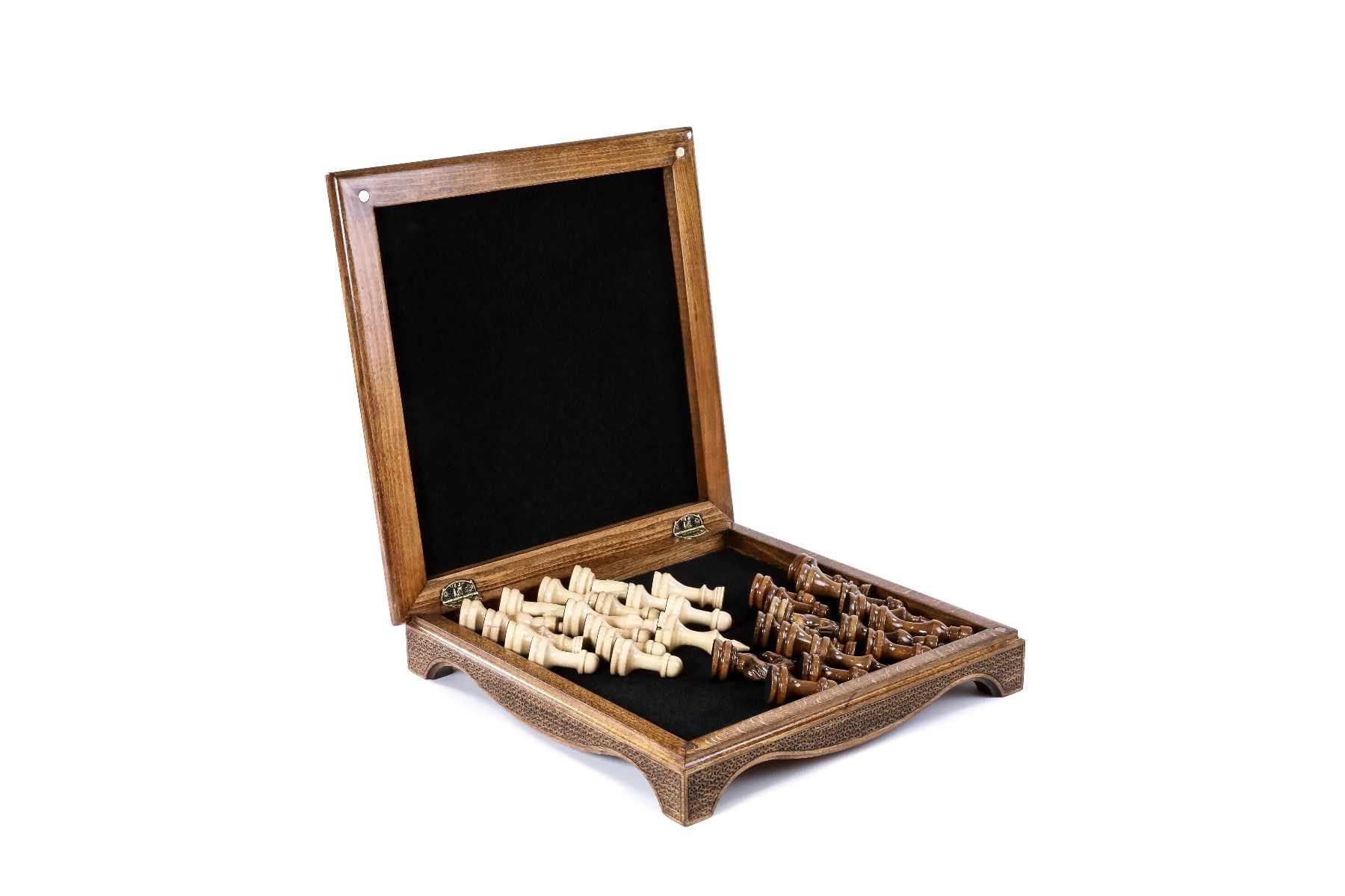 This unique box-style chess is carved from one piece of beech wood. The box stand features beautifully carved edges and legs and the top opens to store the chess pieces.