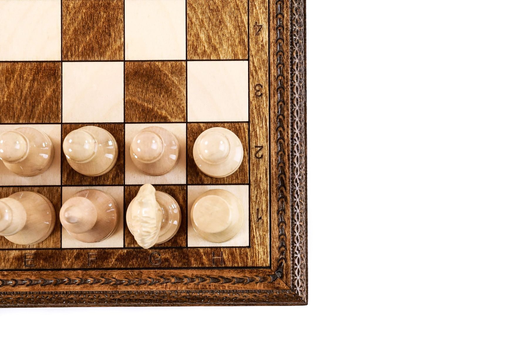 - 32 playing pieces, made of beech and walnut wood, with velvet fabric applied to bottom of each piece,
