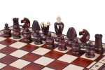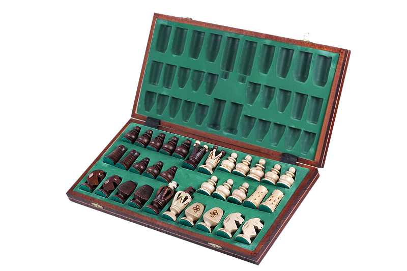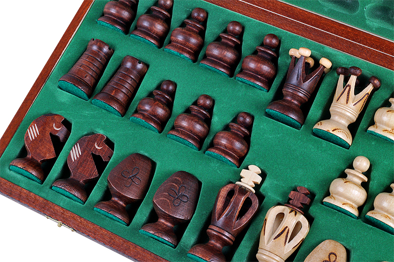Superb value 19 Inch Royal wooden chess set bundle features solid hornbeam and sycamore wood chessmen with unique pattern and quality wooden polished chess board. The folding chess board has an insert tray for the chess pieces storage inside.  This set stands out from all our large selection of wooden chess sets with its unique and exclusive pattern. The robust hardwoods and expert craftsmanship mean this set will last for years of enduring chess games.