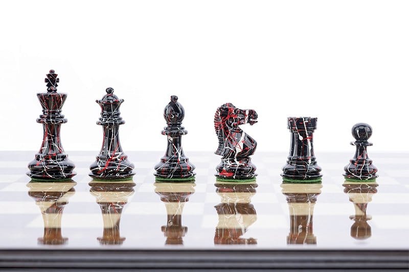 20 Inch Chess Set Colored adds a new, fun and alternative interpretation to the classy Staunton style sets. It features Dubrovnik 1959 Fischer Special Designed chessmen and a 20-inch chess board, skillfully crafted from sycamore and maple. The chess pieces are hand-carved, polished and added that extra colour paint for an exciting twist in the familiar forms. The chessmen have a 3″ king and include 2 extra queens. They are all weighted and felted at the base to ensure the wood is well protected.