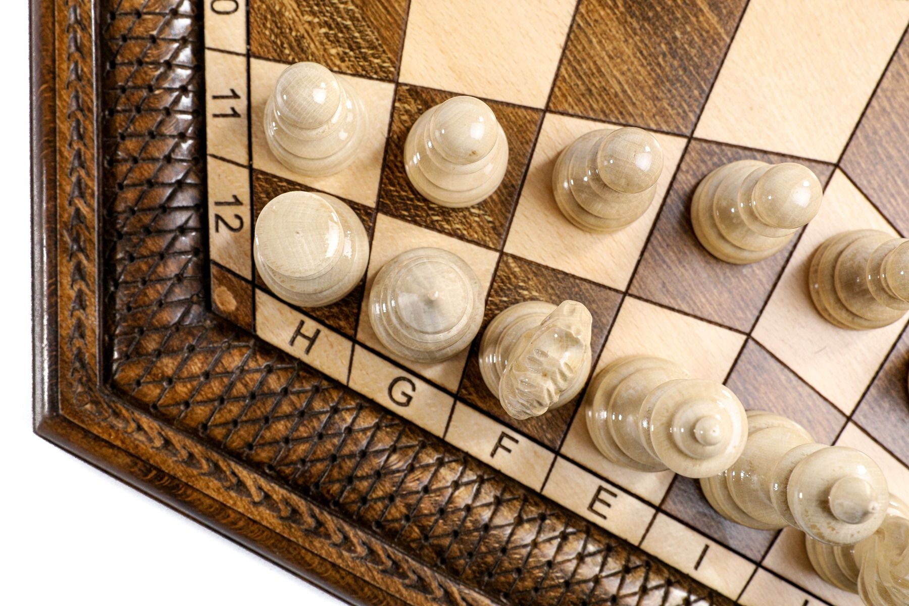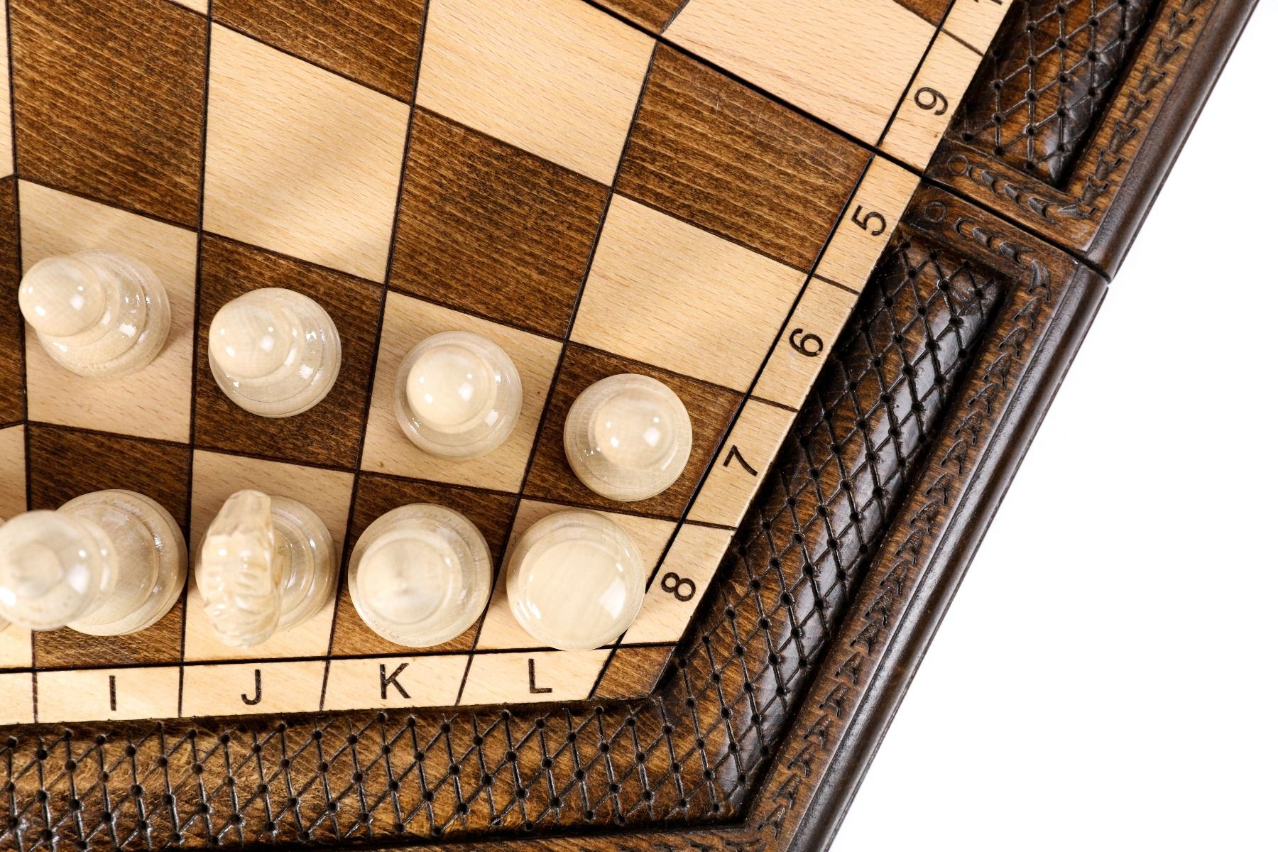It is played by three players on a special three-sided board. Each player gets 16 chess figures. There are 48 white, black, and red figures in total.