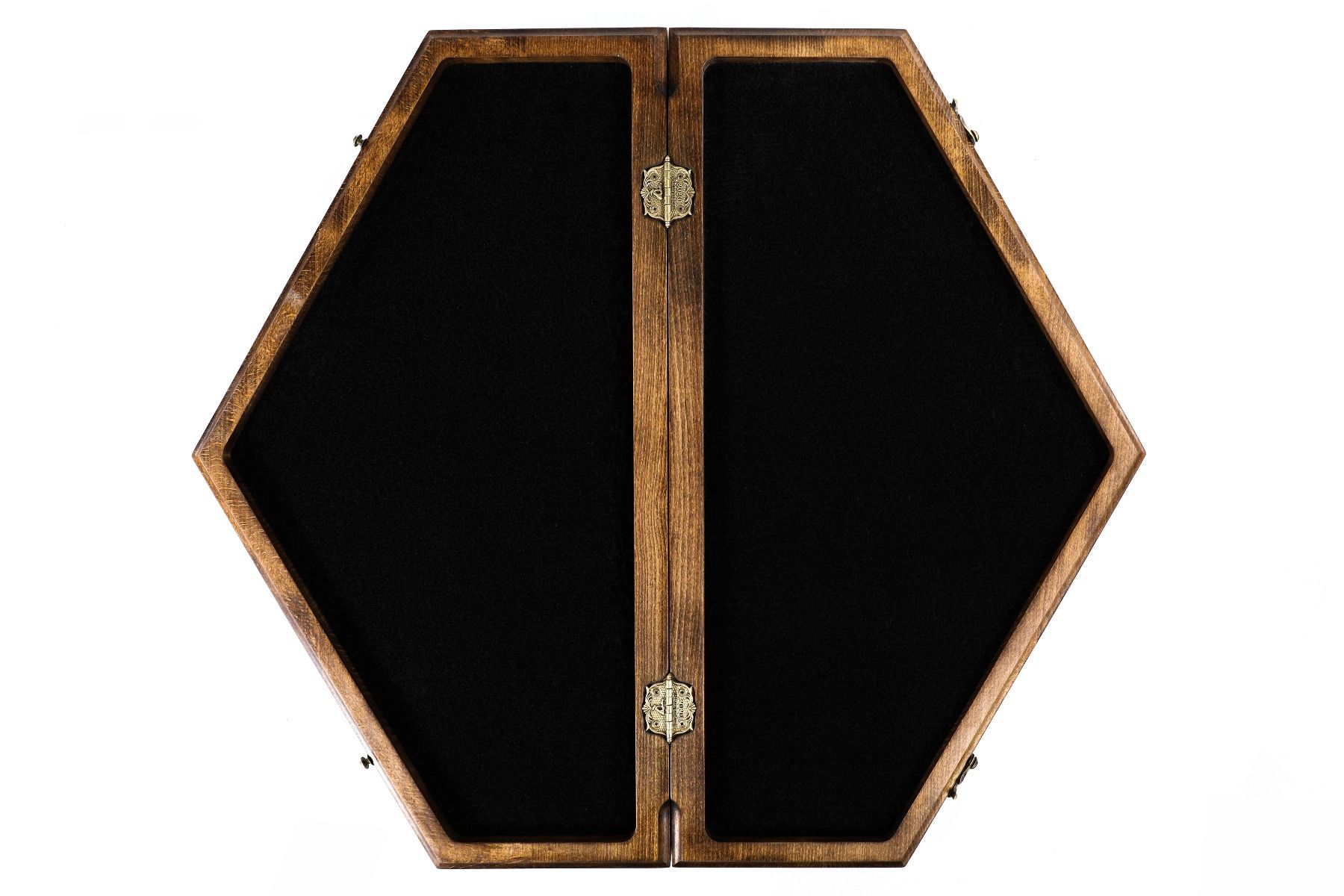 This model is completely handcrafted. It is varnished. The hinges and locks are made of cast bronze. The entire playing field is made of one piece of wood.