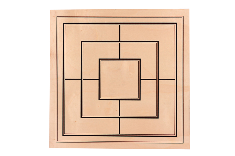 This double-sided 52x52cm veneer chessboard has been crafted from sycamore. The black squares have been printed. The chess board has a square size of 58mm and it is ideal for our larger chessmen with a King height of 98mm. The Mill (9 Men’s Morris) sycamore veneer board has also been printed in black. This board is available with alphanumeric notation only.