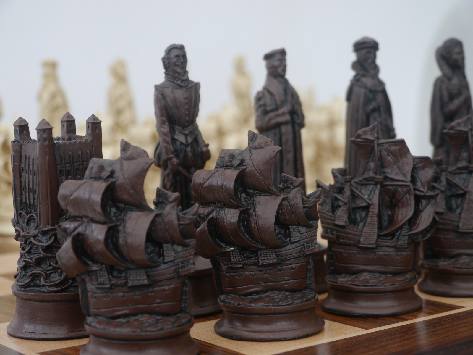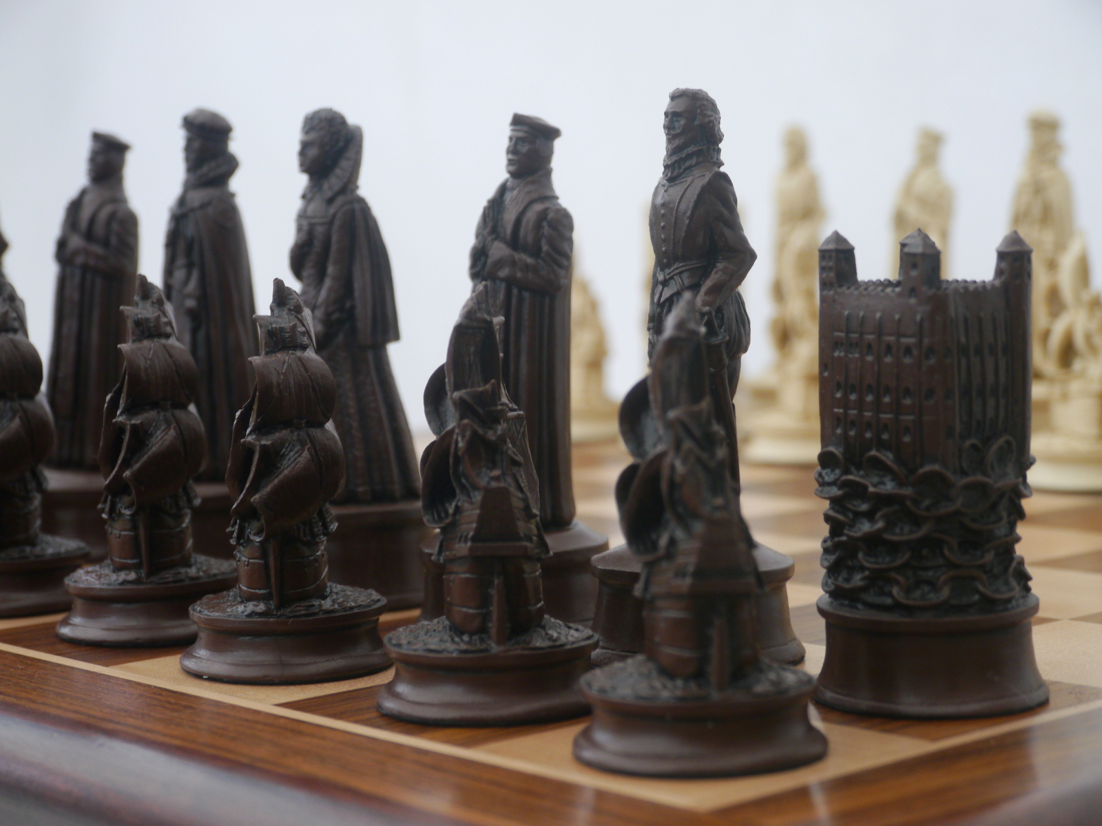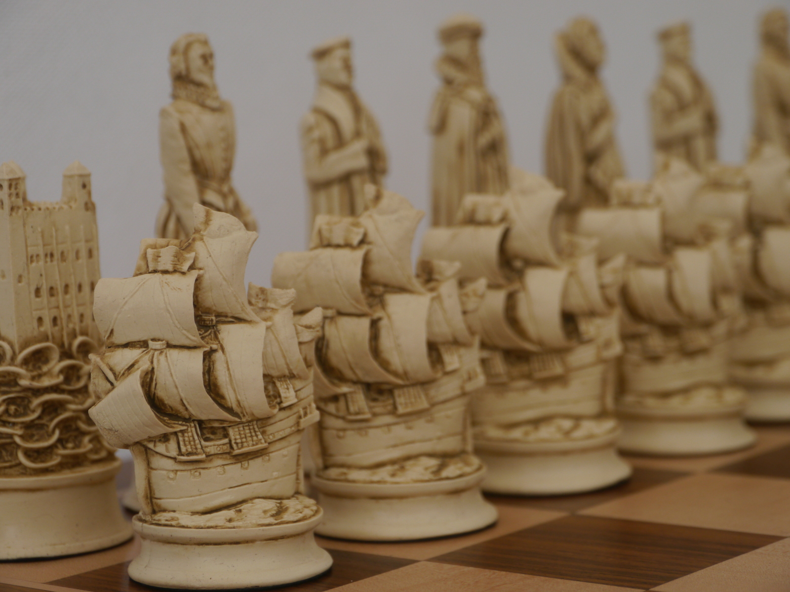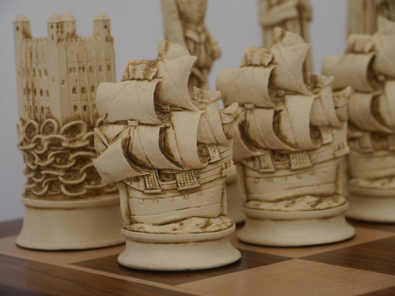 The King represent Sir William Cecil who was The Queen’s Chief Advisor. Queen pieces are features Queen Elizabeth I. Bishop has Matthew Parker who was the Archbishop of Canterbury. Knight and Rook represent Sir Walter Raleigh and White Tower of The Tower of London respectively while the pawns are Ships of the English Fleet representation.