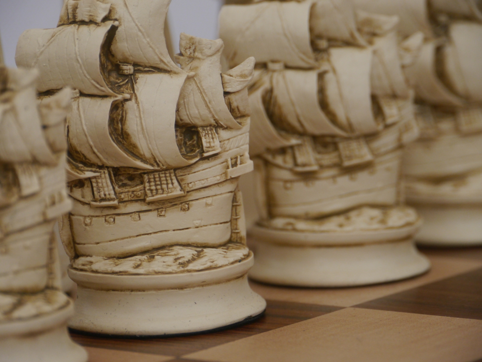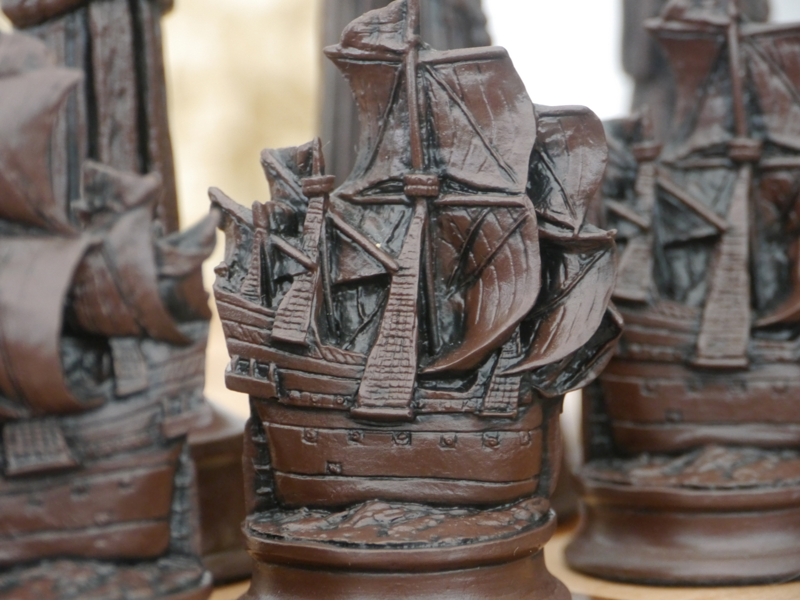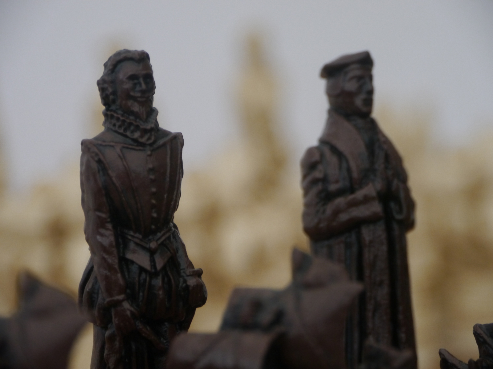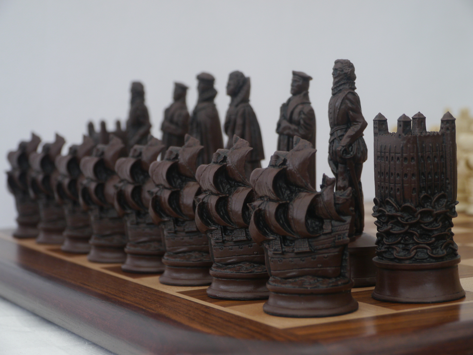 The King represent Sir William Cecil who was The Queen’s Chief Advisor. Queen pieces are features Queen Elizabeth I. Bishop has Matthew Parker who was the Archbishop of Canterbury. Knight and Rook represent Sir Walter Raleigh and White Tower of The Tower of London respectively while the pawns are Ships of the English Fleet representation.