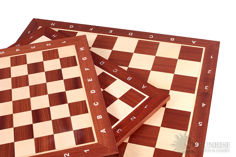 This 59x59cm / 23×23 inches veneer chessboard has been crafted from sycamore and mahogany. This fine chess board has a square size of 64mm and it is ideal for our largest chessmen with a King height of 100mm. This board is available in dark (mahogany) or in light (sycamore) border, with or without alphanumeric notation.