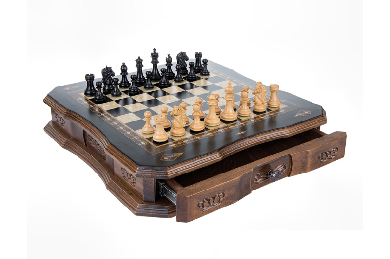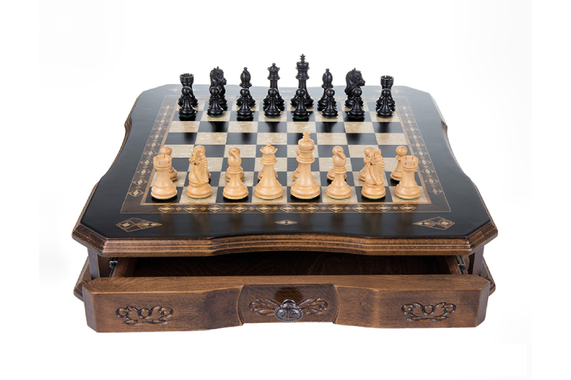 Das 51 cm (20 Zoll) große Schachspiel Antique ist eine einzigartige Darstellung von Qualität, Geschicklichkeit und Handwerkskunst. Es zeigt fachmännische Details, die in den von Hand polierten und fertig geschnitzten Springer-Schachfiguren zur Schau gestellt werden und sie kommen mit zusätzlicher Dame für ein reibungsloseres Schacherlebnis. Die Figuren sind alle beschwert und mit Filz versehen, um sowohl die Schachfiguren als auch das Brett zu schützen. Das Schachbrett hat ein elegantes Design mit fließenden Kurven und filigranen Details. Dieses Set ist das krönende Juwel der gesamten Auswahl an Schachpiel-Sets.