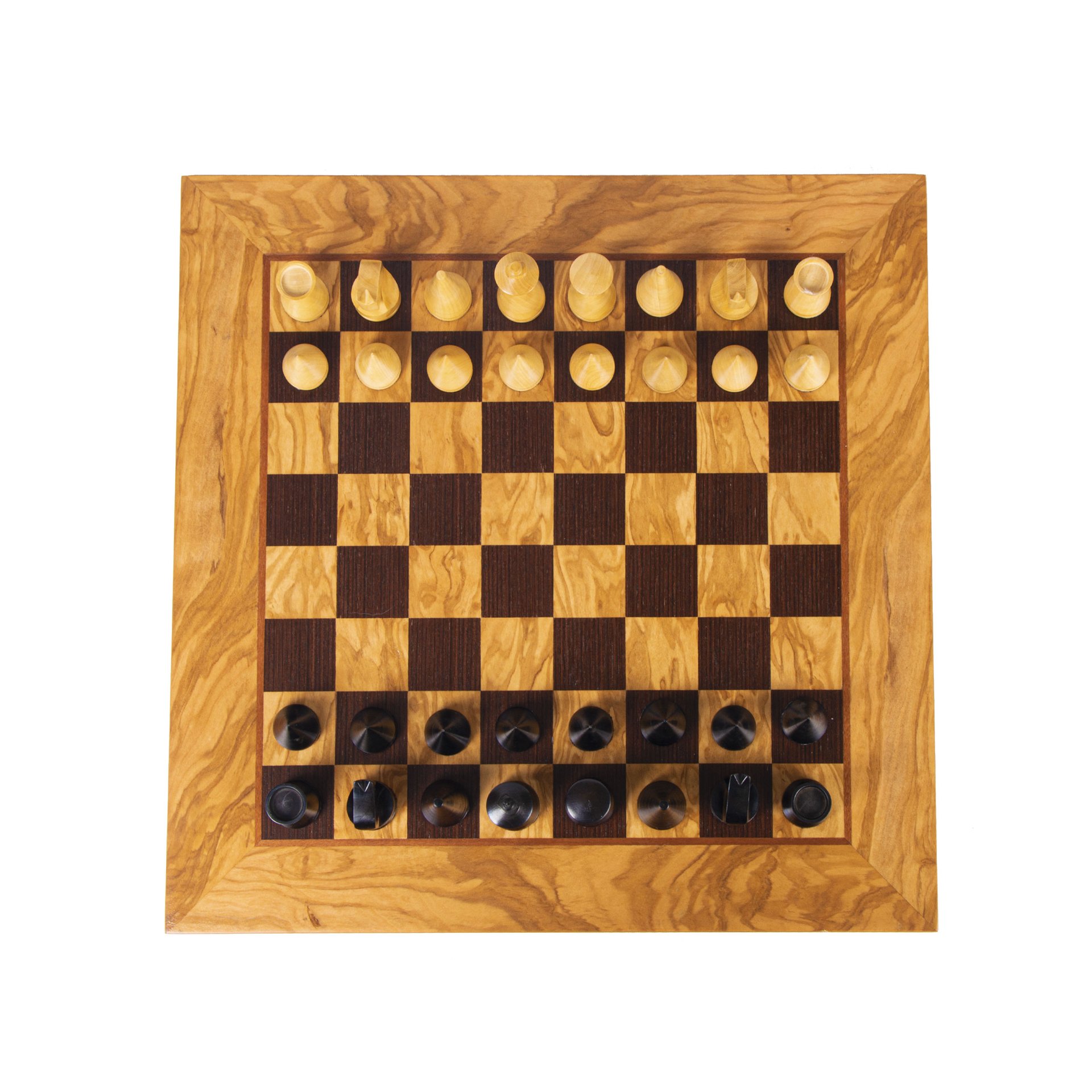 Olive Burl Chess set 40x40cm (Medium) with Modern Style Chessmen (7.6cm King) in Ebonized black and ivory.